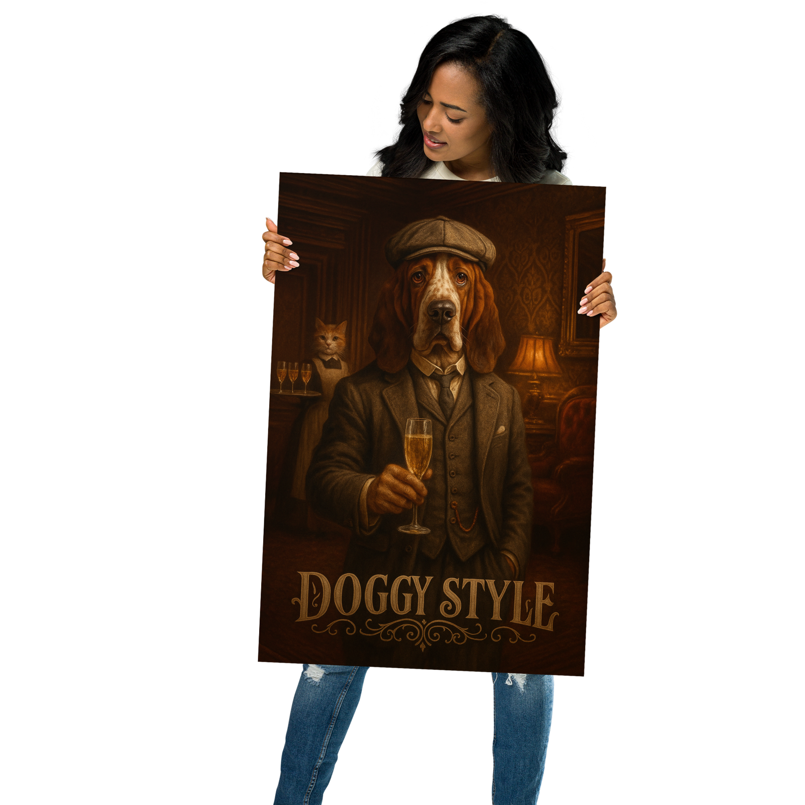 The portrait is created in a rich, dark oil painting style, giving it a refined and classic feel that will enhance any room’s décor. The art has a slightly glossy finish and is designed to be fingerprint-resistant. Below the dignified dog, the playful phrase “DOGGY STYLE” is scripted elegantly, providing a clever, humorous contrast to the dog’s traditional attire. Look closely and you’ll spot a discreet cat waitress in the background, adding an extra layer of visual wit.