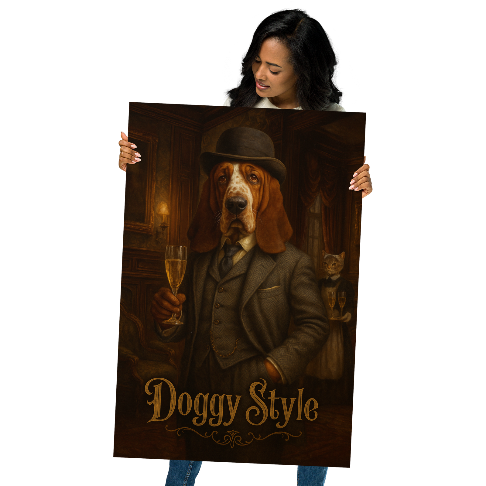The portrait is created in a rich, dark oil painting style, giving it a refined and classic feel that will enhance any room’s décor. The art has a slightly glossy finish and is designed to be fingerprint-resistant. Below the dignified dog, the playful phrase “DOGGY STYLE” is scripted elegantly, providing a clever, humorous contrast to the dog’s traditional attire. Look closely and you’ll spot a discreet cat waitress in the background, adding an extra layer of visual wit.