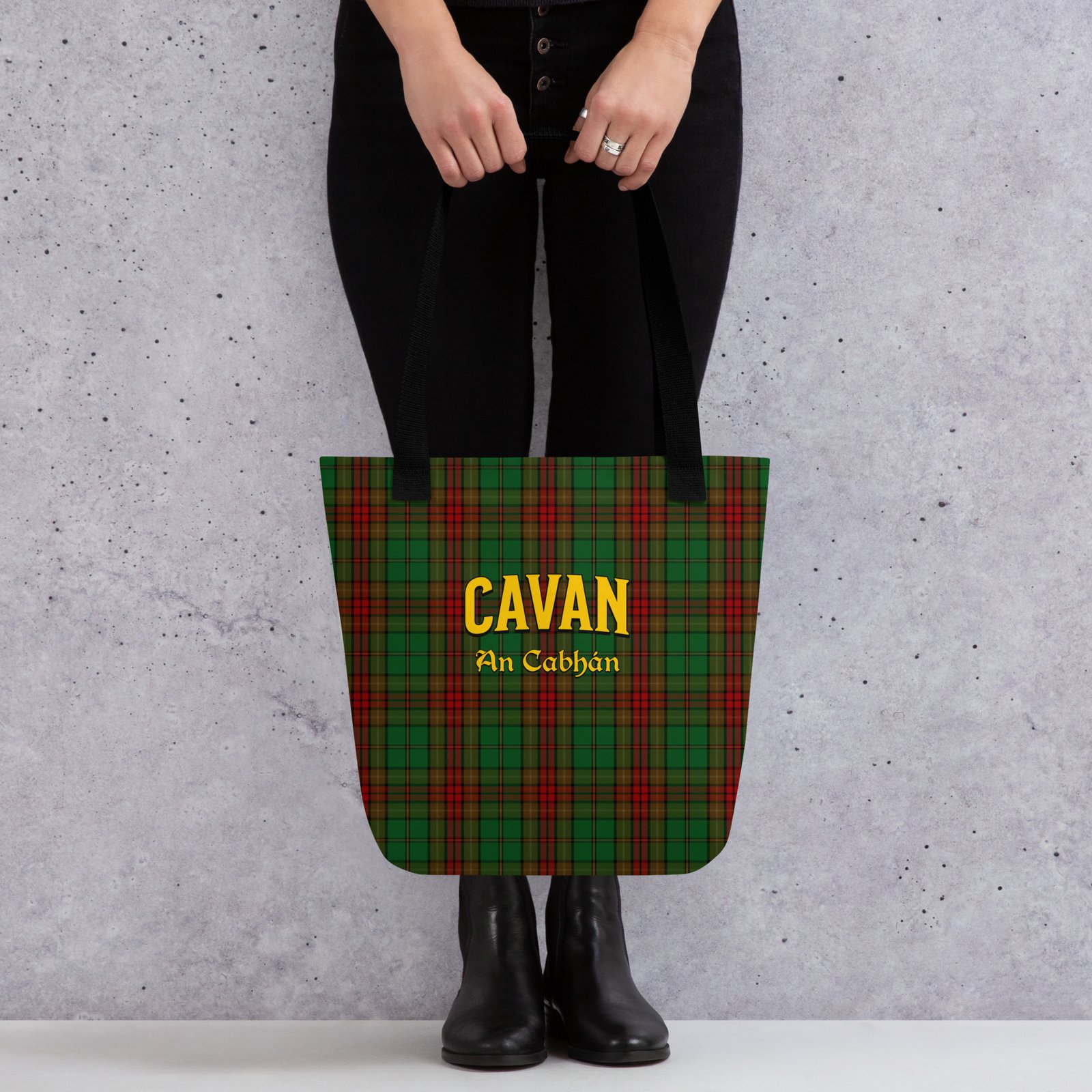 Stand out with this bold tote, decorated in a printed version of the famous Cavan tartan. Strong, spacious, and stylish—carry your essentials with a nod to Cavan’s tradition.