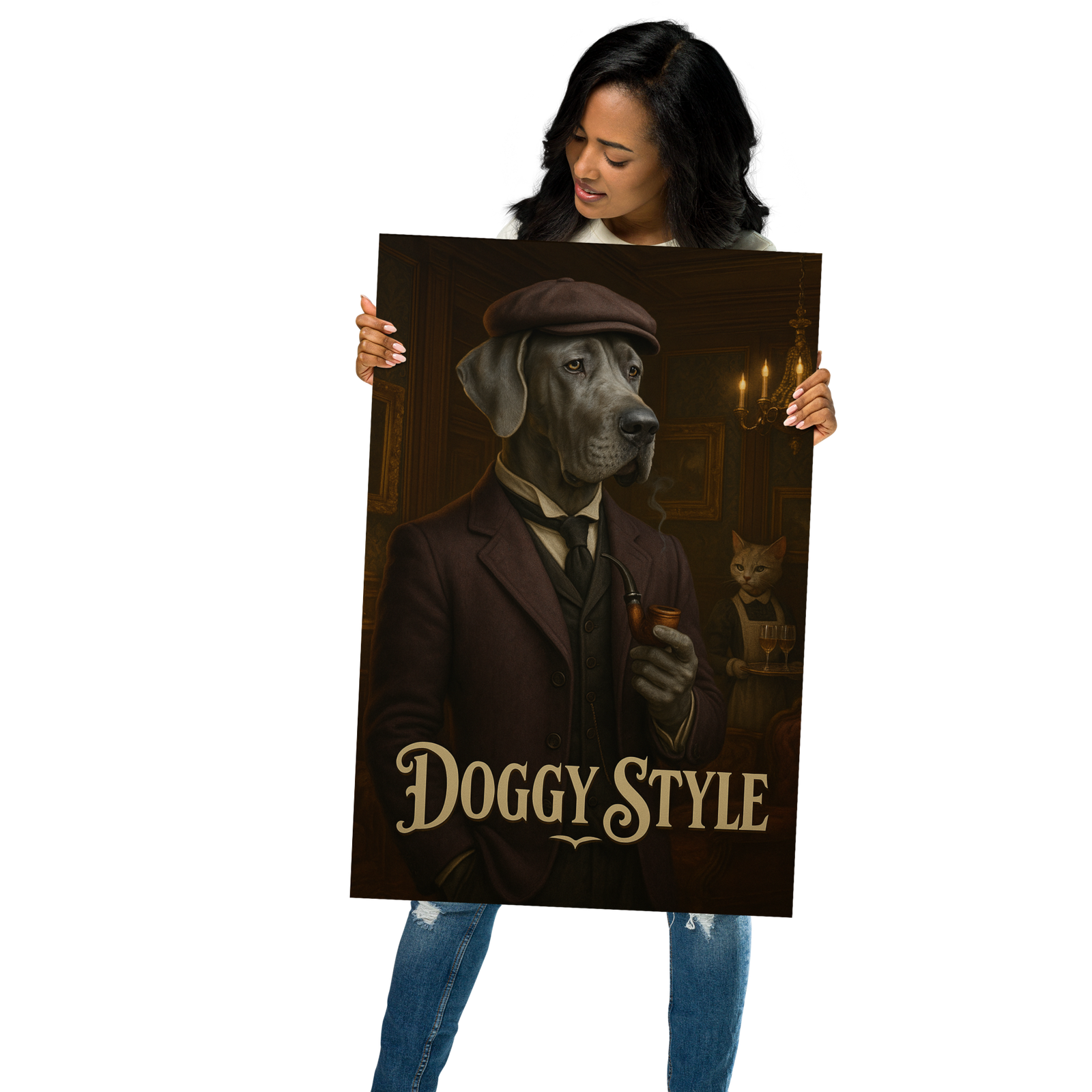 The poster’s oil painting style and rich, gentlemanly colors give it a refined, classic feel that will elevate any room’s décor. Beneath this colossal canine, the bold phrase “DOGGY STYLE” is scripted elegantly, providing a clever, humorous contrast to the dog’s serious demeanor. Look closely and you’ll spot a meticulous cat waitress in the background, adding an extra layer of visual wit.