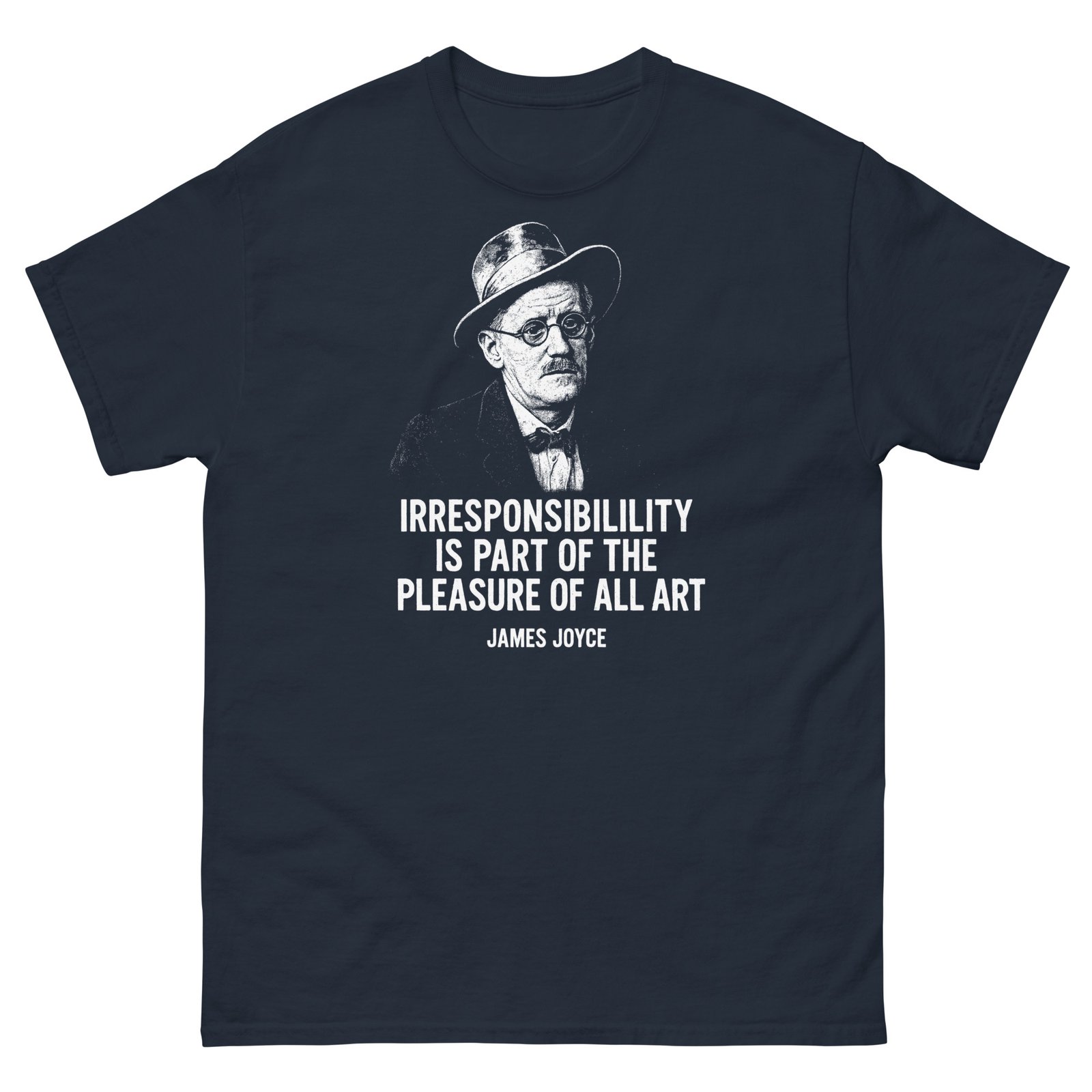 Celebrate the boundary-pushing spirit of modernism with this James Joyce unisex t-shirt. It features a distinguished portrait of the author and his famous, thought-provoking quote: “Irresponsibility is part of the pleasure of all art.” Made from comfortable, high-quality 100% cotton, this shirt is a perfect fit for bookworms, writers, and anyone who appreciates literary genius and a touch of rebellious wit.