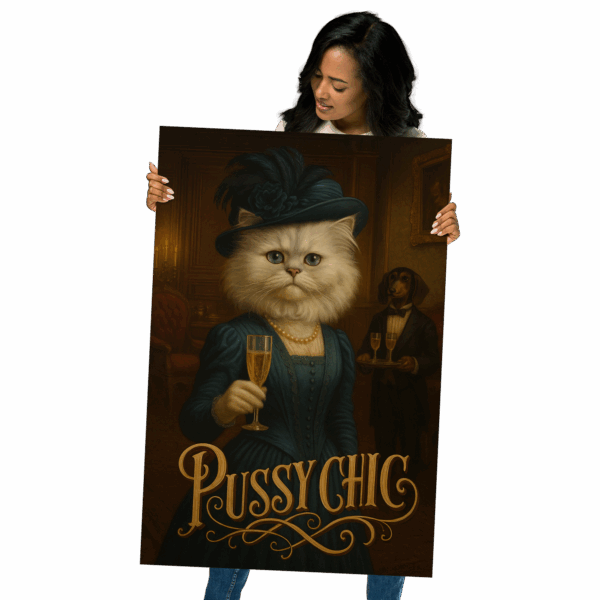 Add a touch of playful “Pussy Chic” luxury to your home with this stunning poster. This vintage-style print features a glamorous Persian Cat in an elegant navy blue gown and feathered hat, sipping champagne while a dog waiter discreetly serves in the background. It’s a high-quality, humorous statement piece perfect for a living room or den. This poster is part of the Pussy Chic Collection.