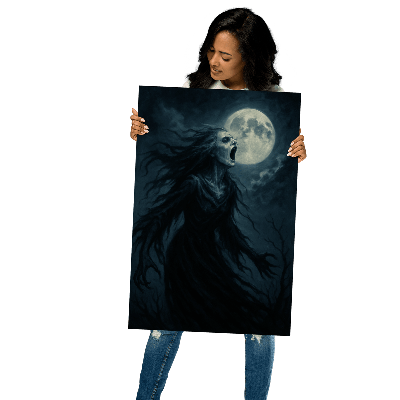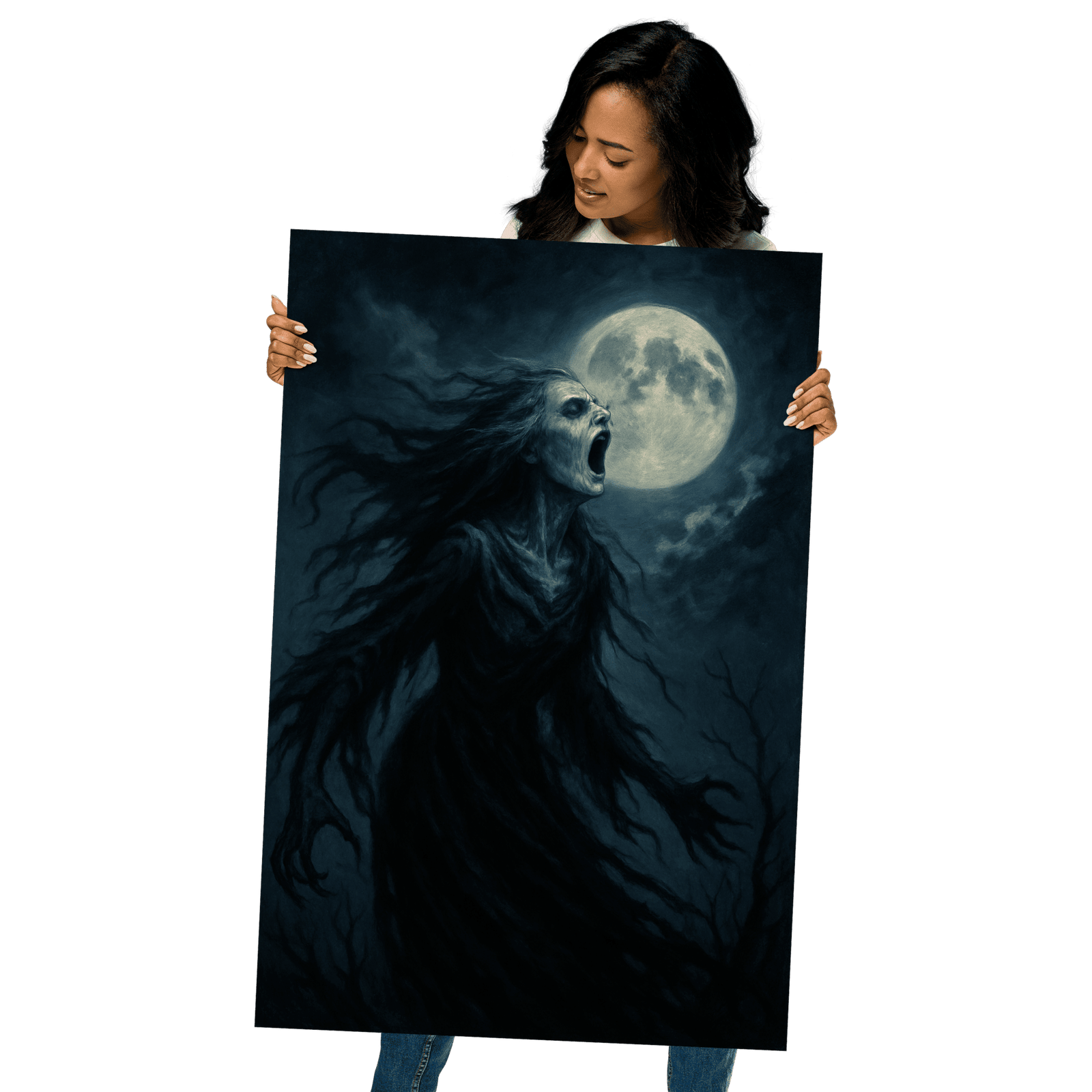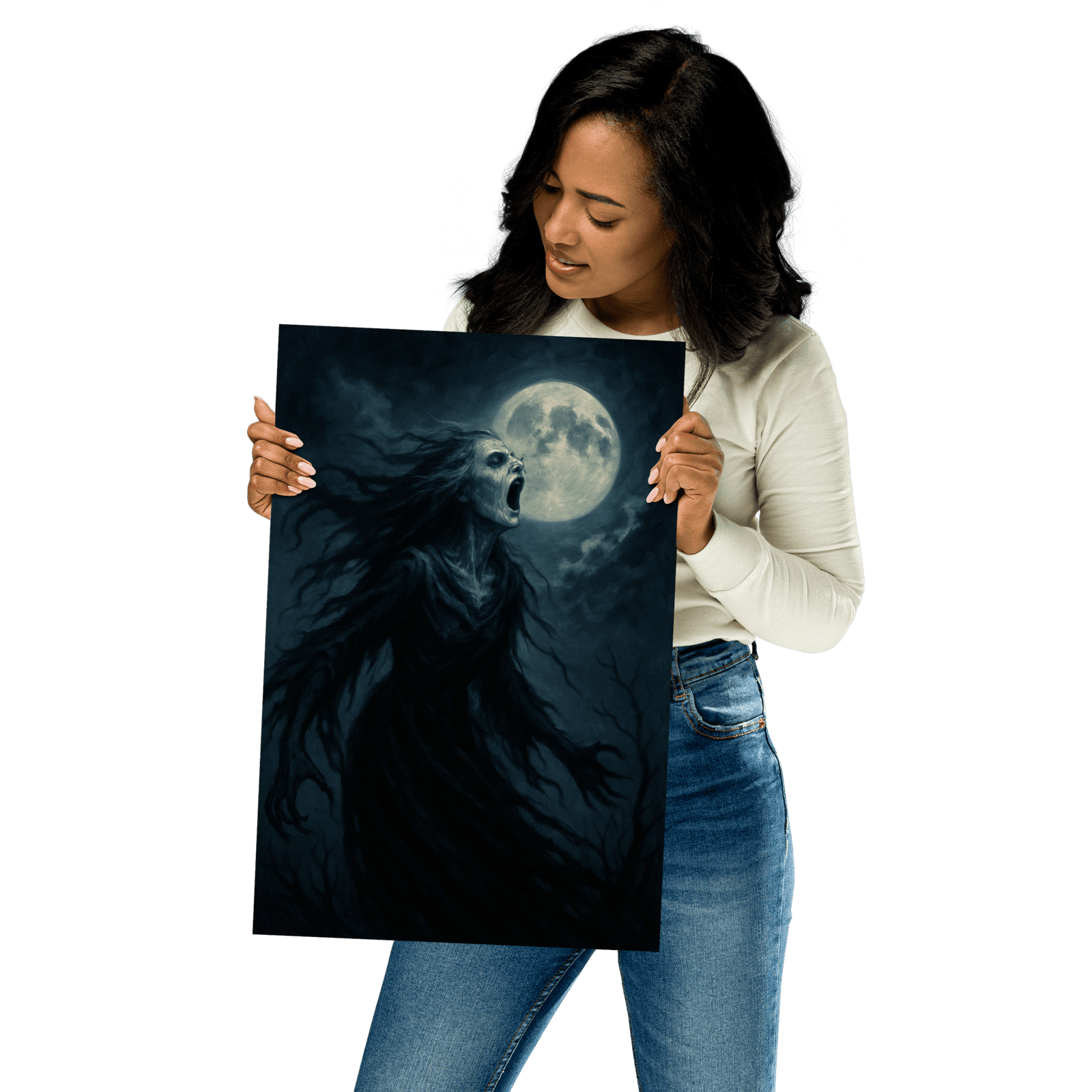 Invoke Celtic folklore with this eerie howling banshee poster under a full moon. Printed on Ultra Premium Luster Photo Paper for gallery-quality depth and low glare, it elevates any dark aesthetic. Ideal wall décor for fans of gothic art, Irish mythology, and spooky home styling.