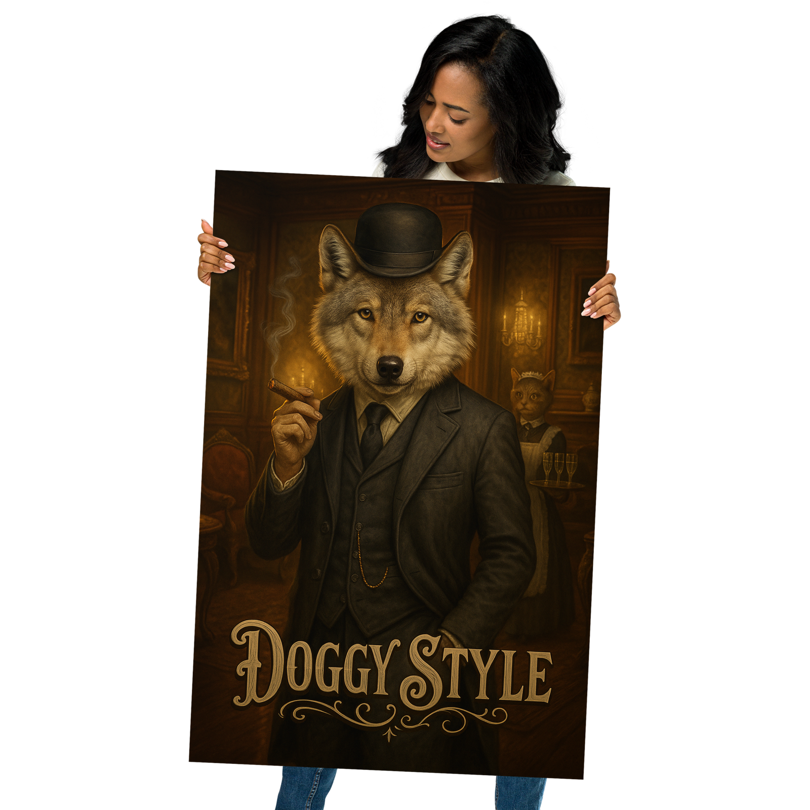 The portrait is rendered in a rich, dark oil painting style, giving it an antique, aristocratic look that will dramatically enhance any room’s décor. Below the dignified wolf, the playful phrase “DOGGY STYLE” is scripted elegantly, providing a clever, humorous contrast to the wolf’s powerful presence. Notice the subtle cat maid in the background, adding a final layer of visual wit to the scene.
