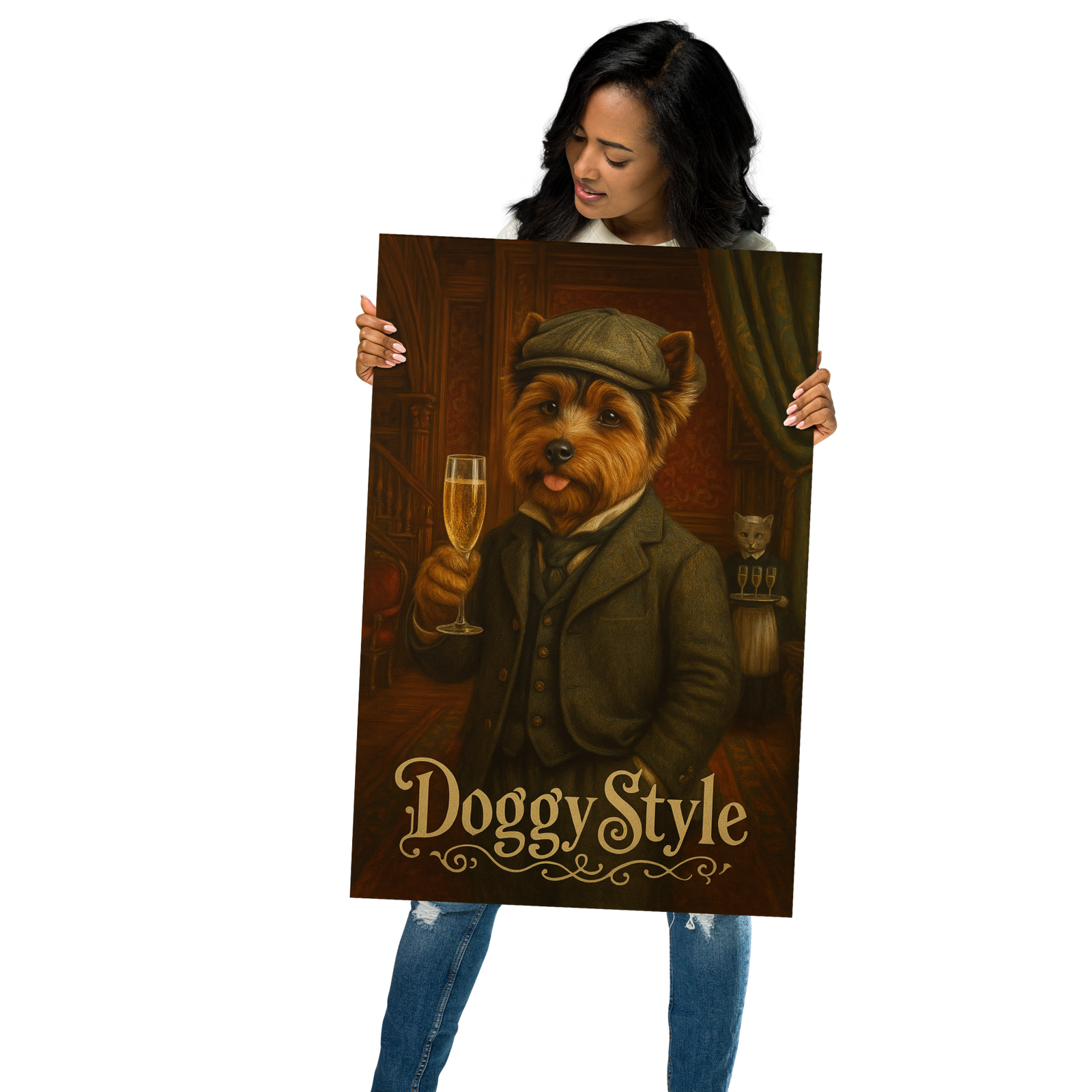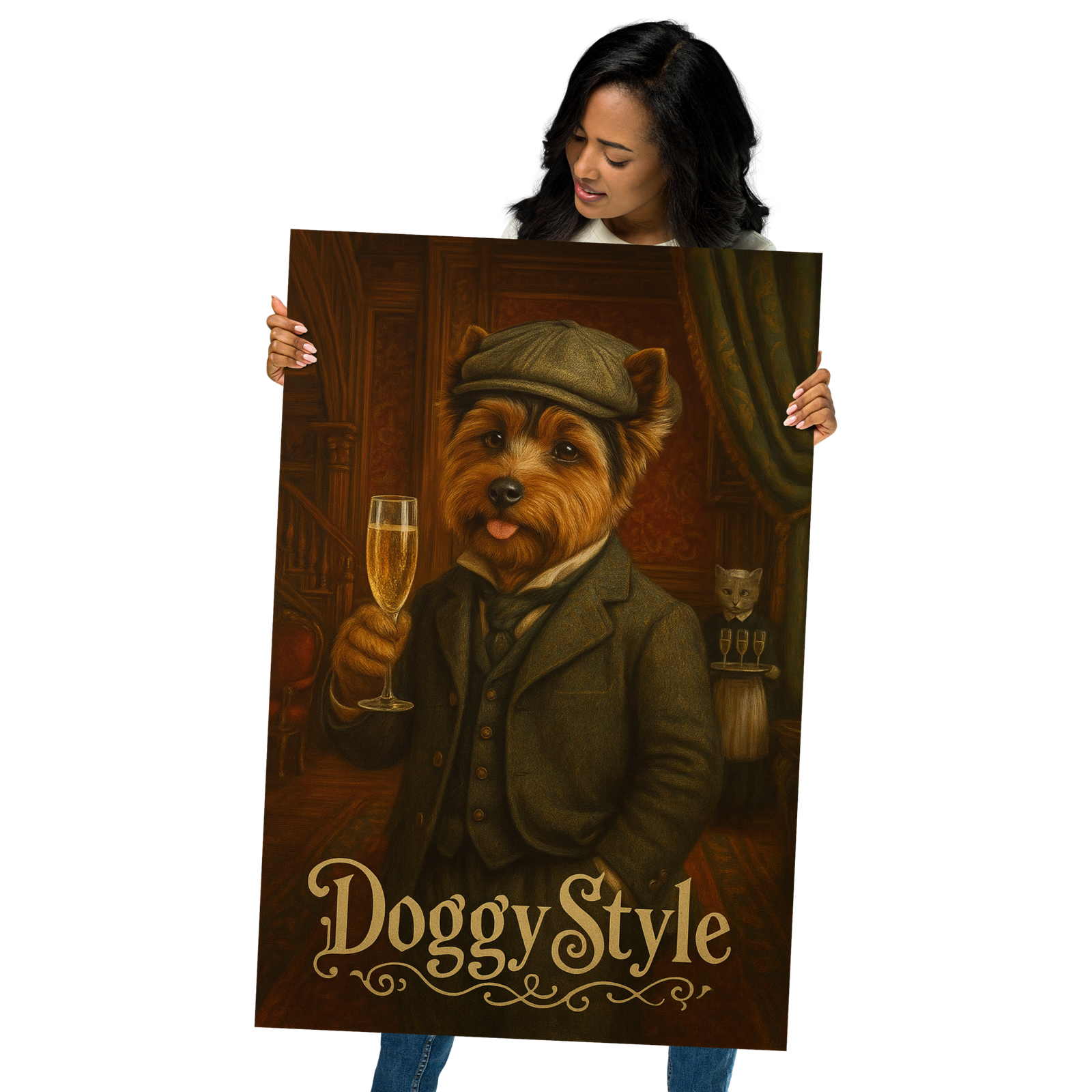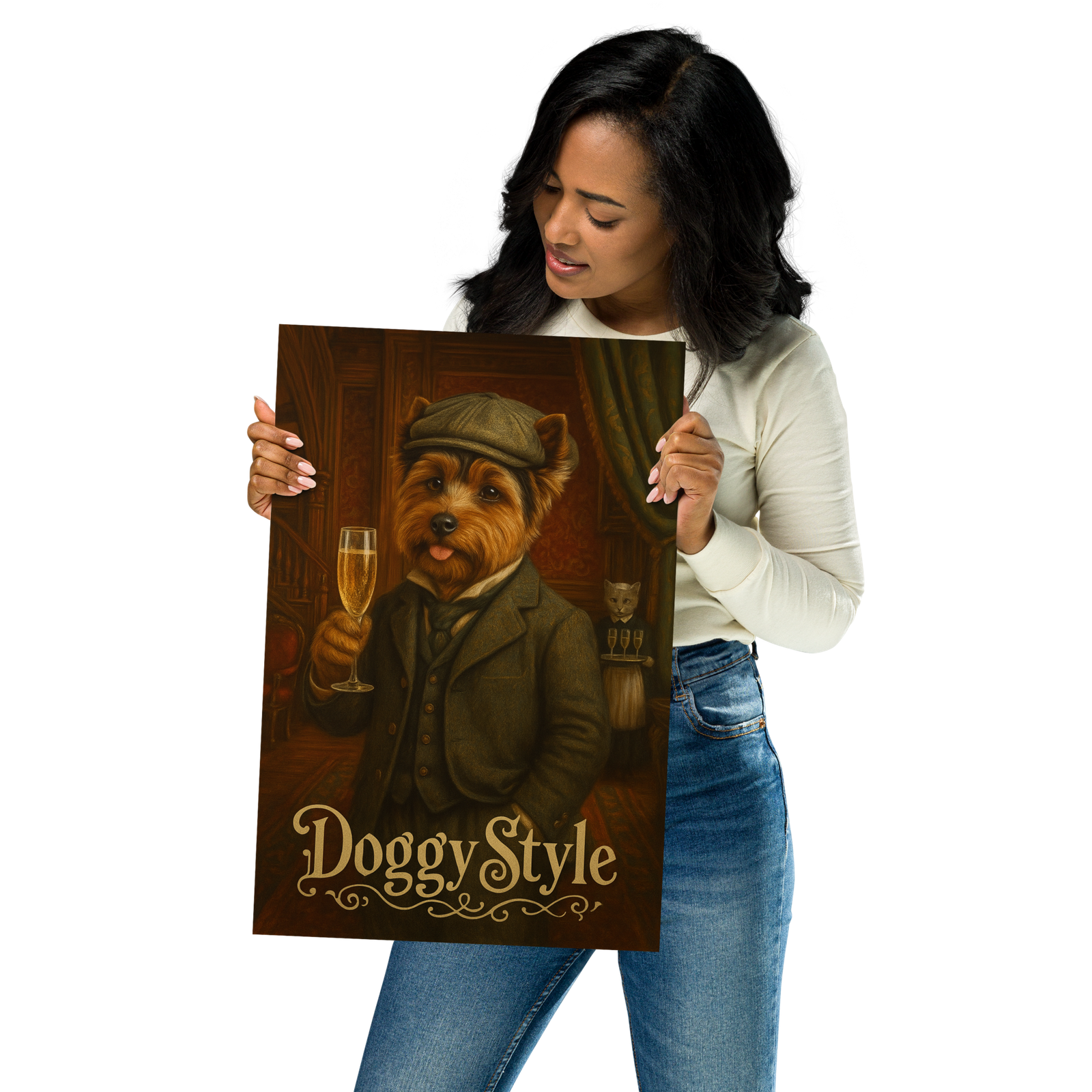 Raise a glass to sophistication with this Yorkshire Terrier “Doggy Style” Poster. This vintage-style print features a dapper Yorkie in a flat cap and suit, tongue out, holding a champagne flute. It’s a humorous and high-quality piece that’s perfect for dog lovers and bar areas. This poster is part of the Doggy Style Collection.